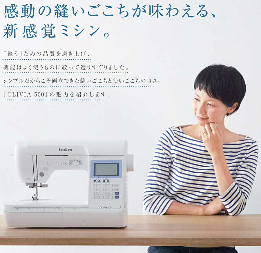 ●型番● OLIVIA500 / オリビア500 /CPH5301 ●フットコントローラー標準装備モデル ●メーカー無償保証3年間モデル ●サイズ● 高さ30cm×幅44.4cm×奥行き24cm ●質量● 9.0kg ●主な機能● ・フットコントローラー標準装備 ・スクエア送り(BOX送り)機構で薄物から厚物までスイスイきれいに生地を送ります。