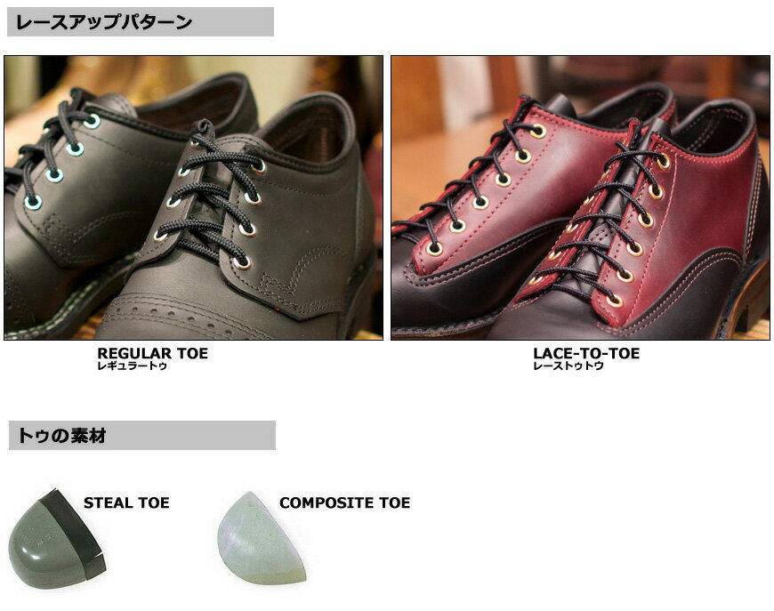 タフな男たちに愛される高い機能性 創業以来変わらない姿勢と新しい挑戦 世界で一つの「あなただけのブーツ」を カスタムオーダーの流れ <1>レースアップパターン ・レギュラー ・レーストゥトウ ※アイレットの数が増えフィット感が増しデザインも変化します。