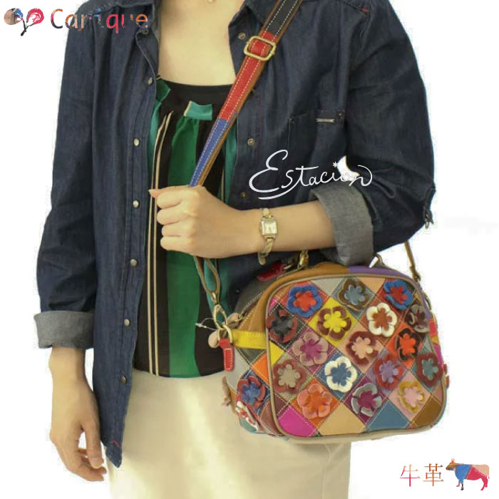 Estacion エスタシオン 【★秋冬新作も♪MAX2000円OFFクーポン配布中★26日1:59まで】 バッグ ショルダー 2way 本革 レディース 斜めがけ 大人 ハンドバッグ 革 パッチワーク 花 フラワー ブラック カラフル 旅行 誕生日プレゼント/ギフト【617】