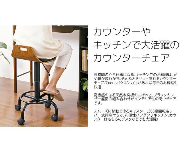 そんなときサッと座れるカウンターチェア『Cuenca(クエンカ)』があれば毎日のお料理も快適!高級感のある天然木突板の曲げ木と、ブラックのレザー座面の組み合わせがインテリア性の高いチェアです。