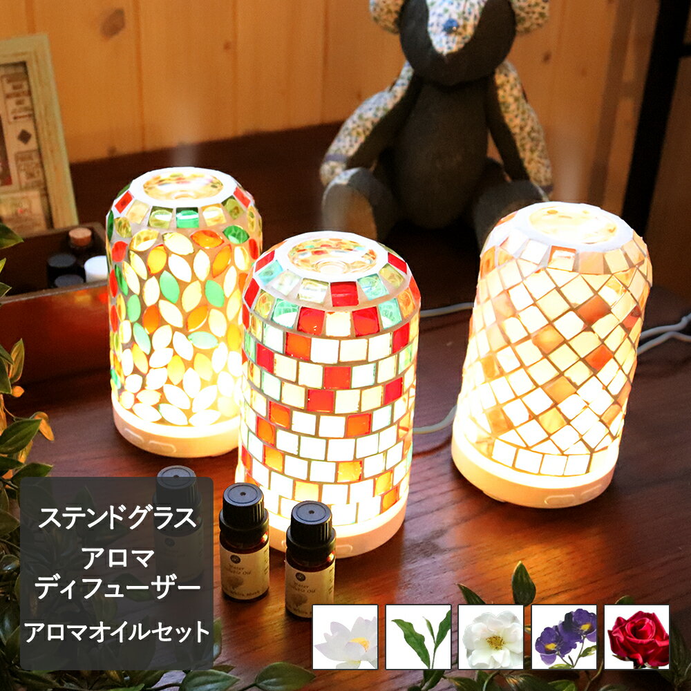 ステンドグラス アロマディフューザー アロマオイルセット | コンパクト 照明 卓上 ガラス 間接照明 アロマオイル アロマランプ ランプ インテリア アロマ ディフューザー アロマデュフューザー 寝室 癒しグッズ プレゼント ギフト リラックス アロマセット オイル 女性